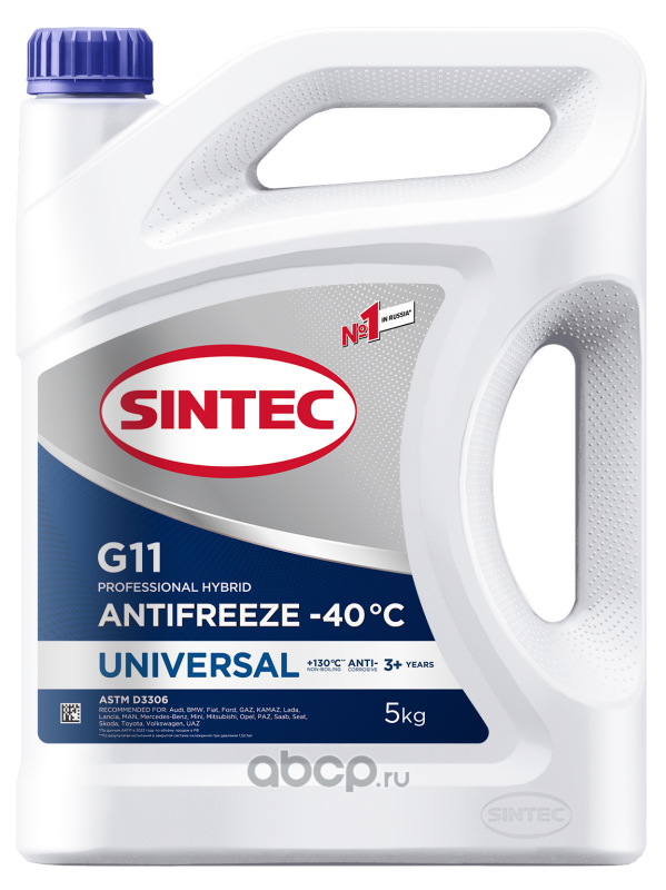 Sintec Антифриз Юниверсал (Universal) G11 синий -40 – готовая к применению высококачественная низкозамерзающая охлаждающая жидкость на основе моноэтиленгликоля и пакета присадок. Обеспечивает правильный тепловой режим эксплуатации двигателя, предотвращает появление коррозии и отложений в системе охлаждения. Обладает эффективными смазывающими свойствами, продлевающими ресурс помпы системы охлаждения. Не повреждает шланги, прокладки и уплотнения системы охлаждения.