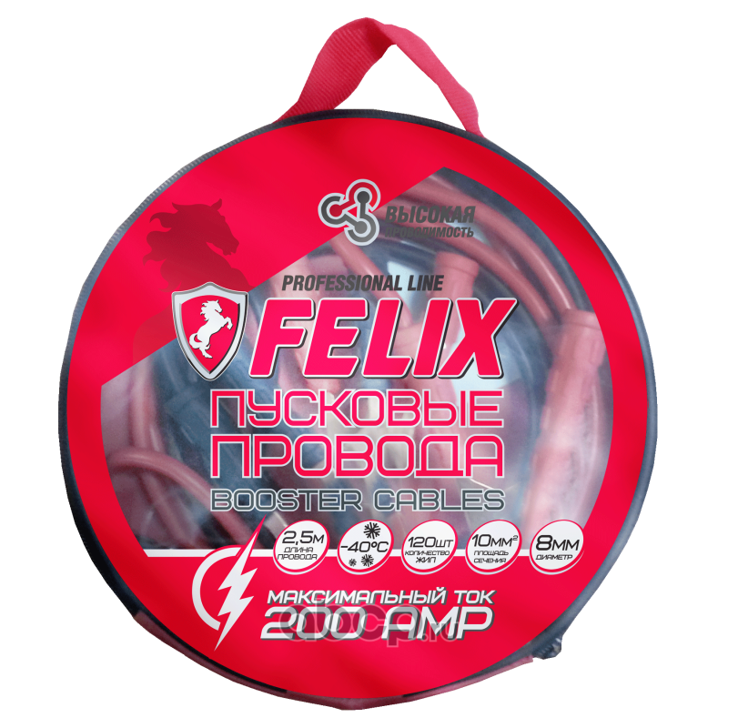 Комплект пусковых проводов Felix в компактном и легком чехле предназначен для подзарядки неработающего аккумулятора от источника питания. Специальная конструкция кабеля и изоляции позволяет выдерживать пусковые токи, величина которых может достигать   до 200 А. Фиксация проводов на заряжаемой АКБ и аккумуляторе-доноре осуществляется с использованием контактов - «крокодилов».
