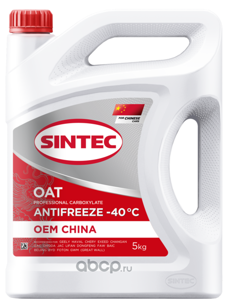 Sintec Антифриз OEM Китай (China) OAT красный -40 – готовая к применению охлаждающая низкозамерзающая жидкость. Изготовлена из высококачественного моноэтиленгликоля и пакета присадок на основе карбоксилатной технологии OAT, специально адаптированной для применения в китайских автомобилях. Полностью соответствует и превосходит требования Chinese National Standard GB 29743, стандарт LEC-II. Не содержит нитритов, нитратов, аминов, фосфатов, боратов и силикатов.